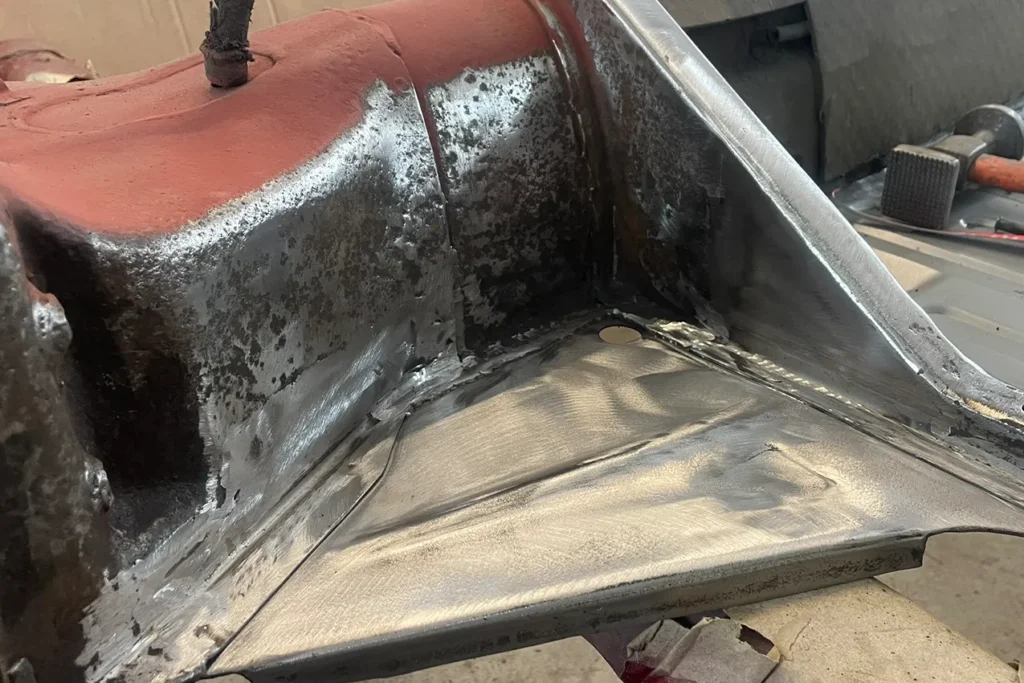 With the car fully stripped back, each repair is being carried out properly from the ground up. Areas such as the floorpan are being cut back to sound metal and repaired with correctly formed, fully welded sections, ensuring strength, longevity, and structural integrity. It’s this level of workmanship and doing the job once, and doing it right that underpins our entire restoration process.